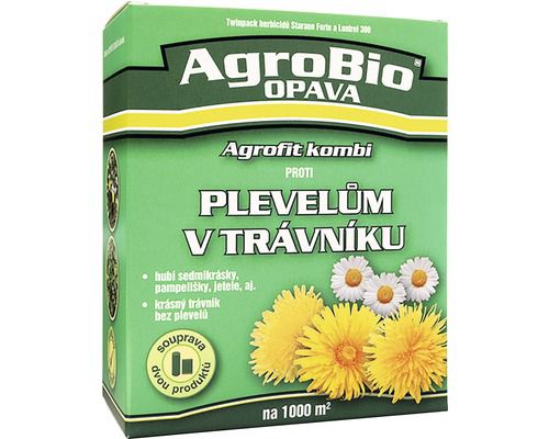 AGROFIT kombi NEW je účinná souprava dvou herbicidů pro hubení plevelů v trávnících. Kombinace dvou účinných herbicidů působí velmi rychle na dvouděložné plevele v trávnících. Účinek je patrný již za několik dní po aplikaci. Dešťové srážky 2 hodiny po aplikaci neovlivní negativně účinek přípravku na plevele. Účinná látka: fluroxypyr 333 g/l (Starane Forte), klopyralid 300 g/l (Lontrel 300) Spektrum účinnosti: okrasné trávníky přípravek je účinný na tyto dvouděložné jednoleté nebo vytrvalé plevele: pcháč oset, rmeny, plevele heřmánkovité, kopretina osenní, turan kanadský, lopuchy, podběl lékařský, chrpa modrák, výdrol slunečnice, pohanka svlačcovitá, regenerující vojtěška setá, svízel přítula, hluchavky, konopice napuchlá, ptačinec žabinec, rdesna, pomněnka rolní, lilek černý, opletník plotní, šťovíky (mladé růžice) Použití: postřikem na vzrostlé plevele max. 1x za vegetační sezónu neaplikujte do 2 dnů po sečení trávníků pozor na úlet postřikové kapaliny při provádění ošetření v blízkosti pěstovaných dvouděložných rostlin přípravek nesmí zasáhnout okolní porosty (pro které není tento přípravek registrován) Balení: vystačí na 1000 m2 plochy